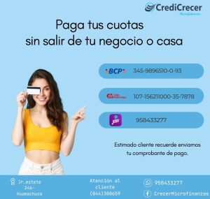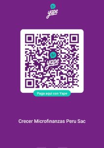Créditos Tus sueños no pueden esperar, constrúyelo hoy mismo. Nuestros créditos hacen posible tu progreso…! Solicita tu crédito Ahora puedes pagar tus cuotas sin salir de tu casa o negocio. También puedes escanear el código QR. CRECER MICROFINAZAS PERU SAC. RUC: 20607605824